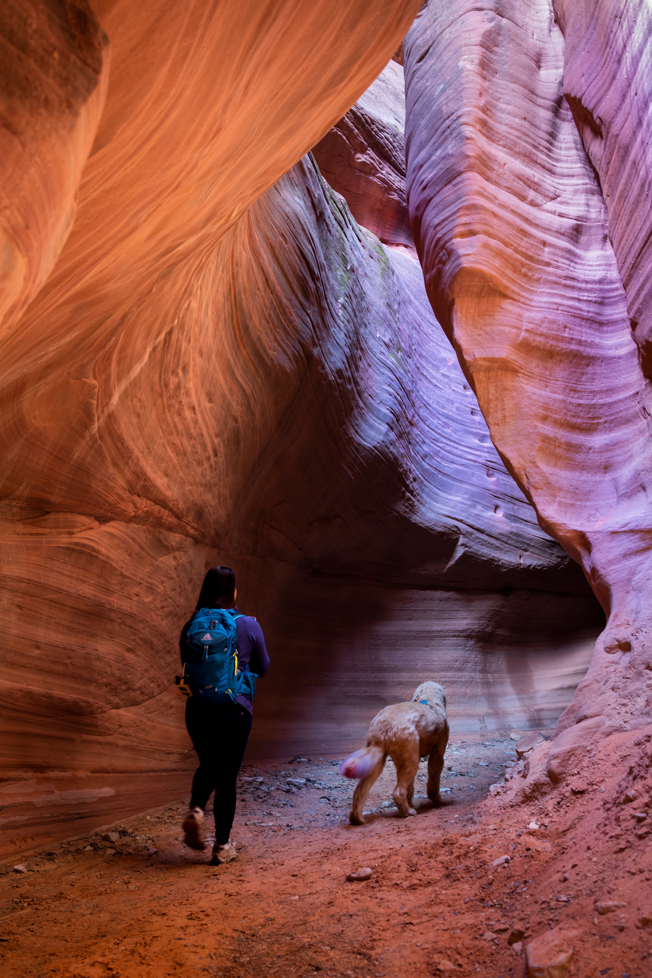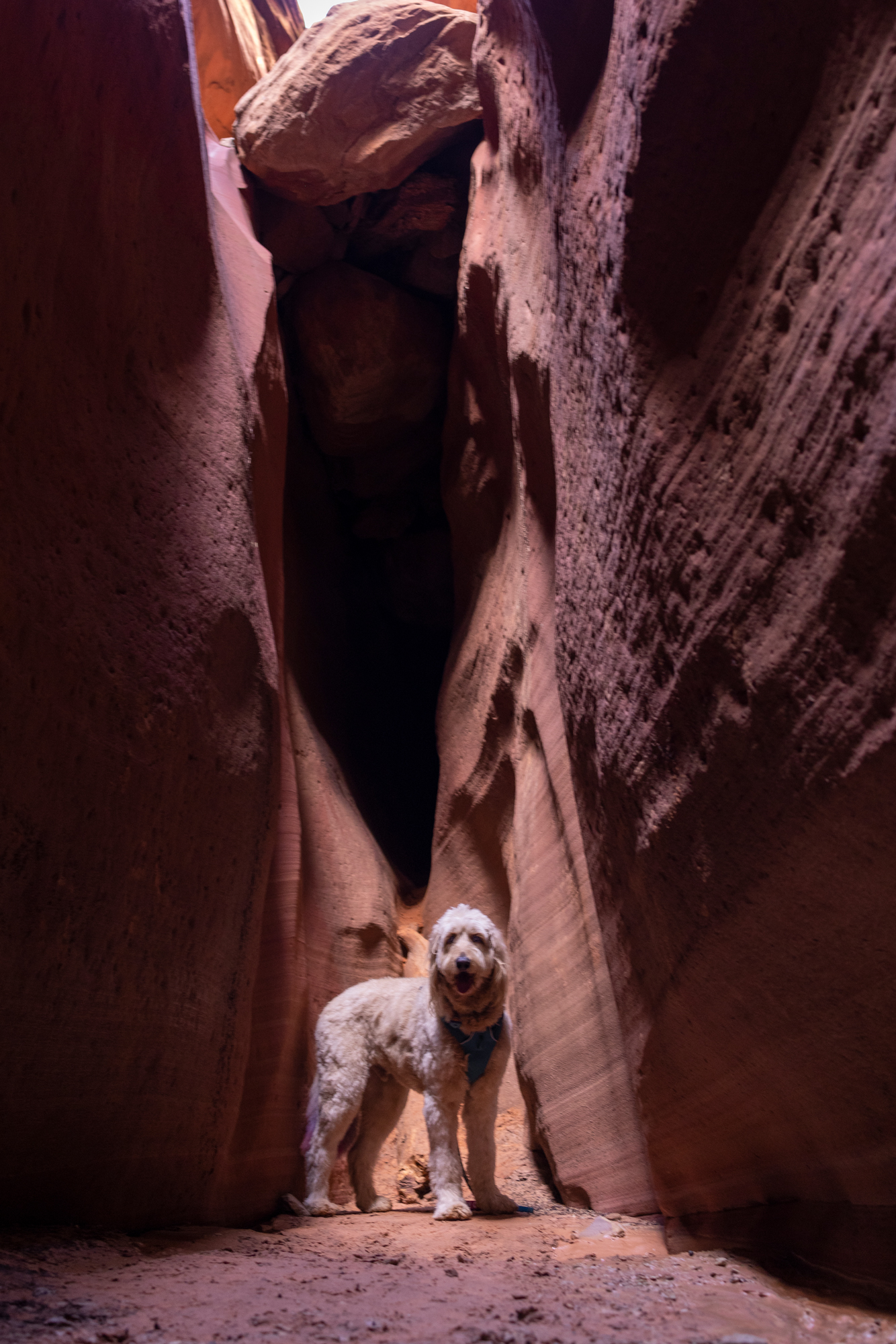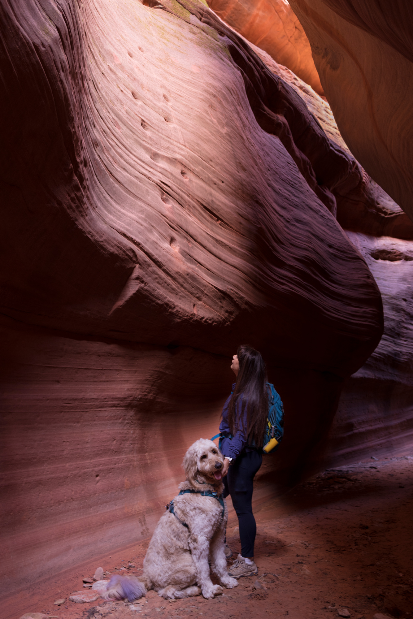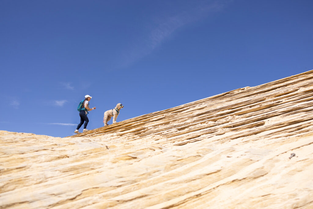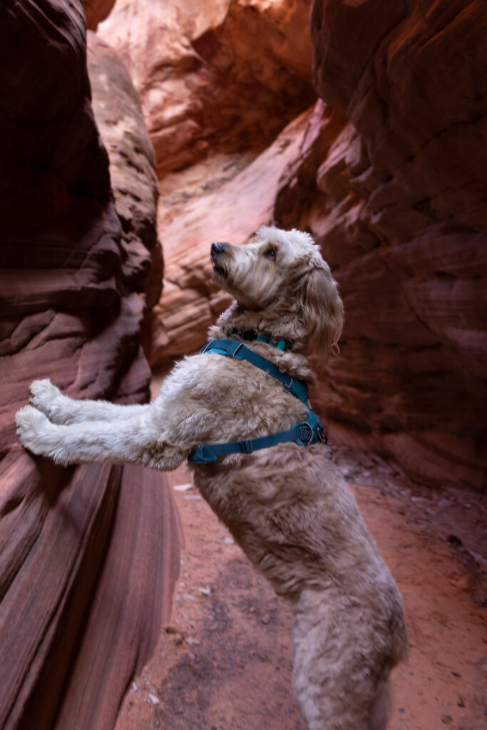 During our tour through Southern Utah’s spectacular slot canyons, Zayn and I documented every aspect of the dog-friendly experience. The resulting images show him confidently navigating smooth sandstone passages, exploring the narrow corridors of Peekaboo Slot Canyon, and providing scale against the stunning white and pink striped formations of the White Wave.