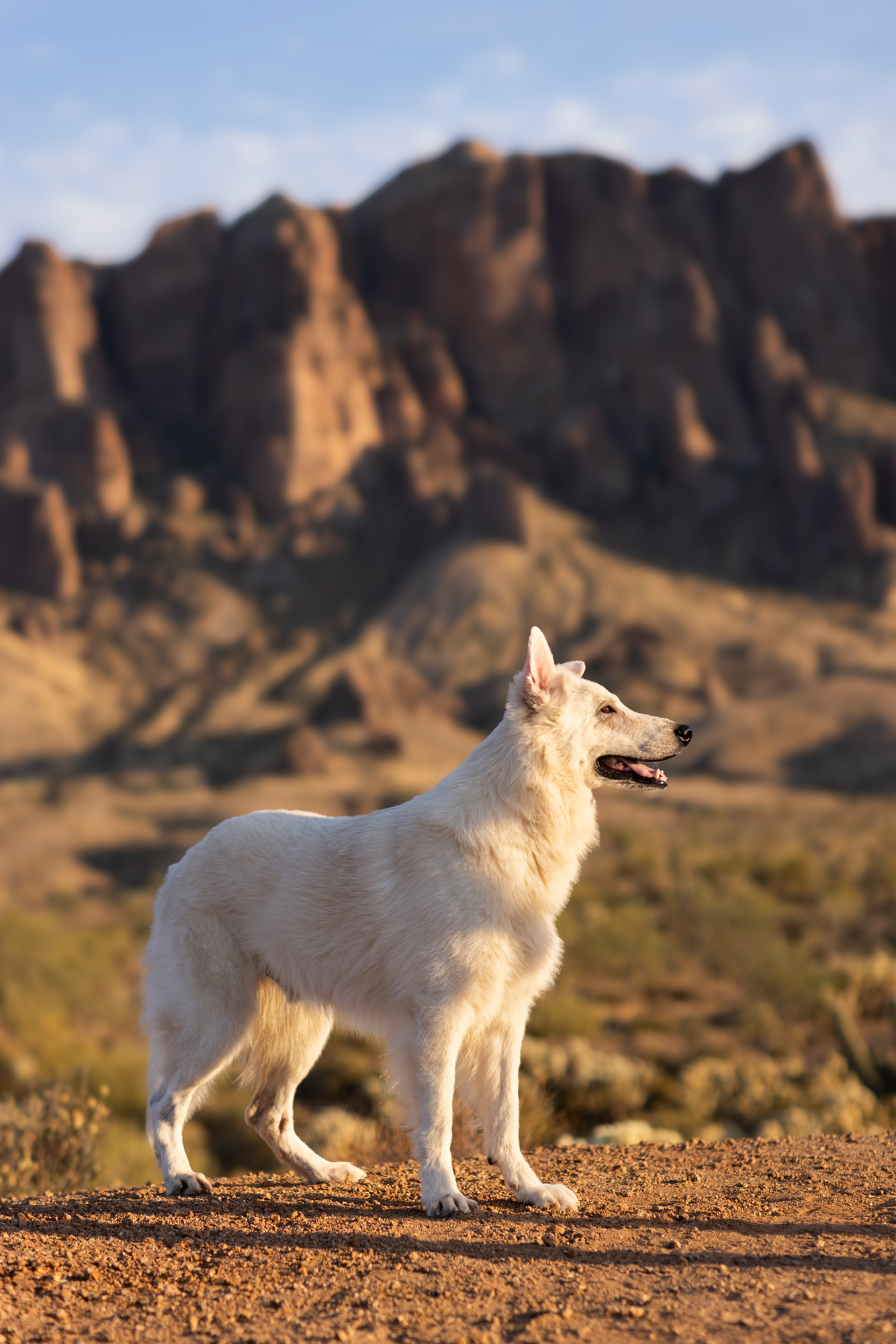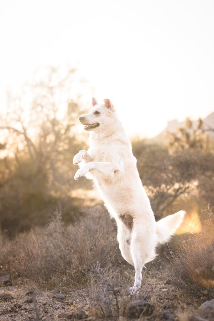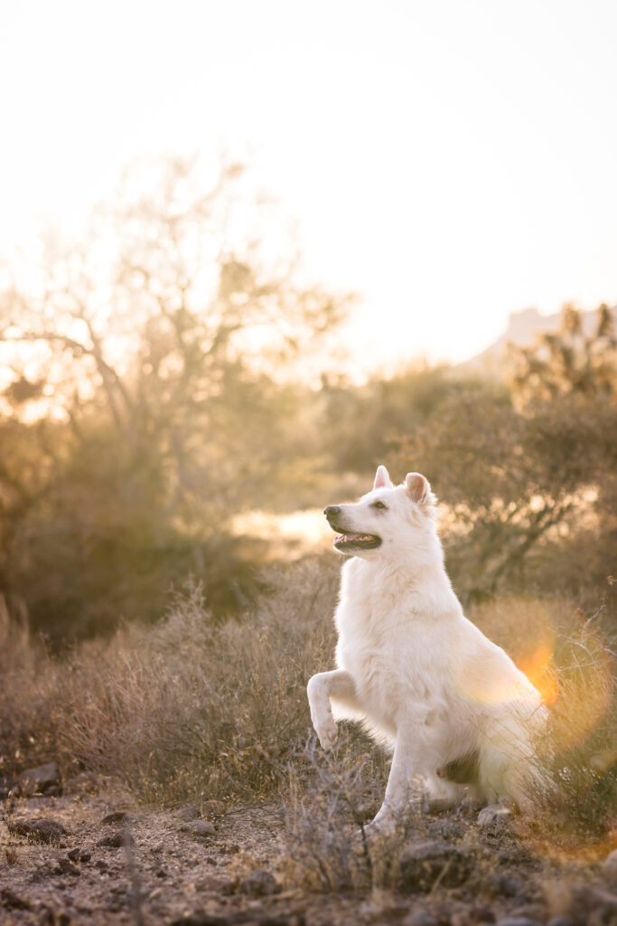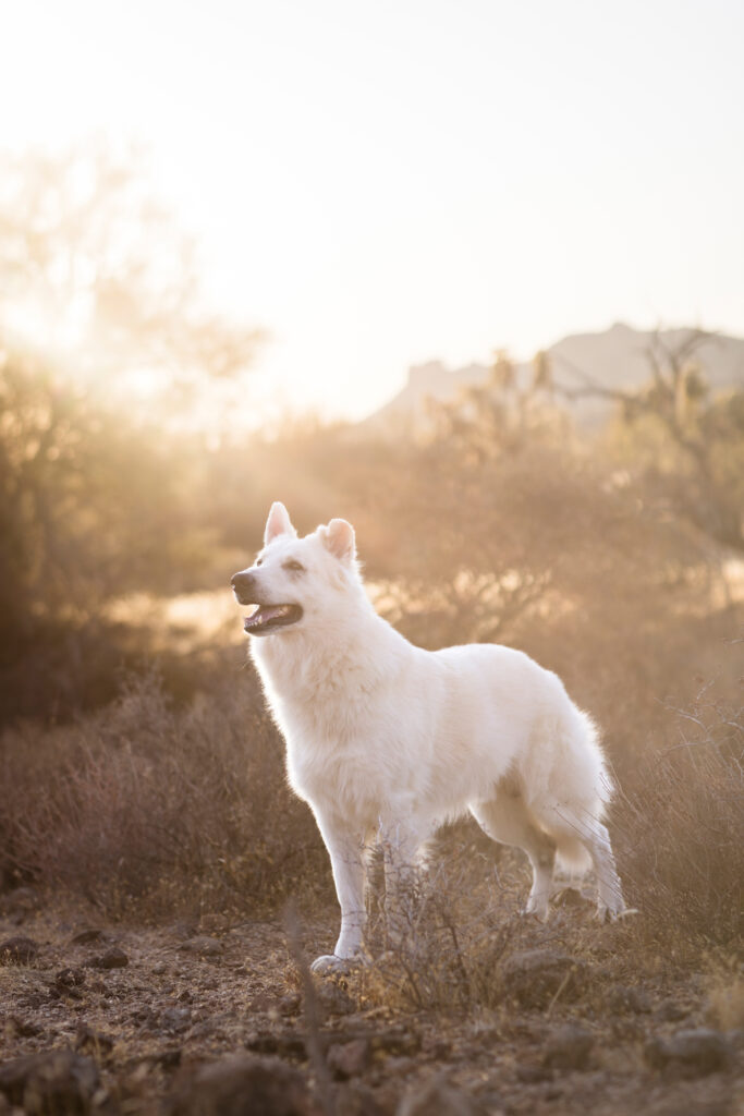 This stunning white Swiss shepherd joined us out at the Superstition Mountains in Apache Junction, Arizona, and the results were nothing short of cinematic. The contrast between Collins’ bright, flowing coat and the rugged volcanic landscape, warm desert tones, and sweeping Arizona sky made every frame feel like it was made for this location.