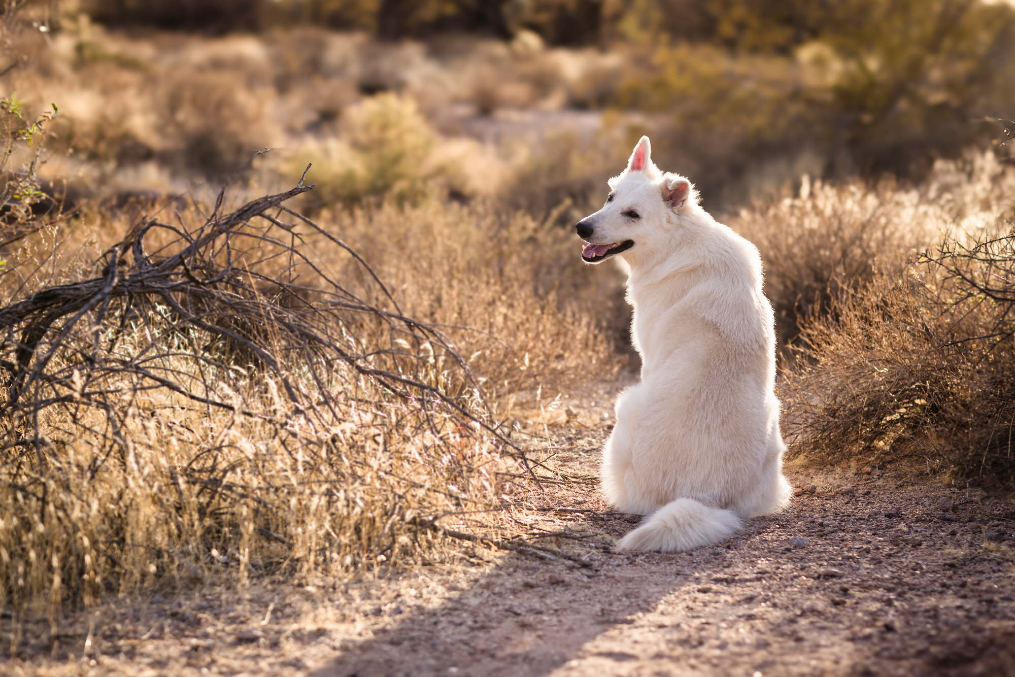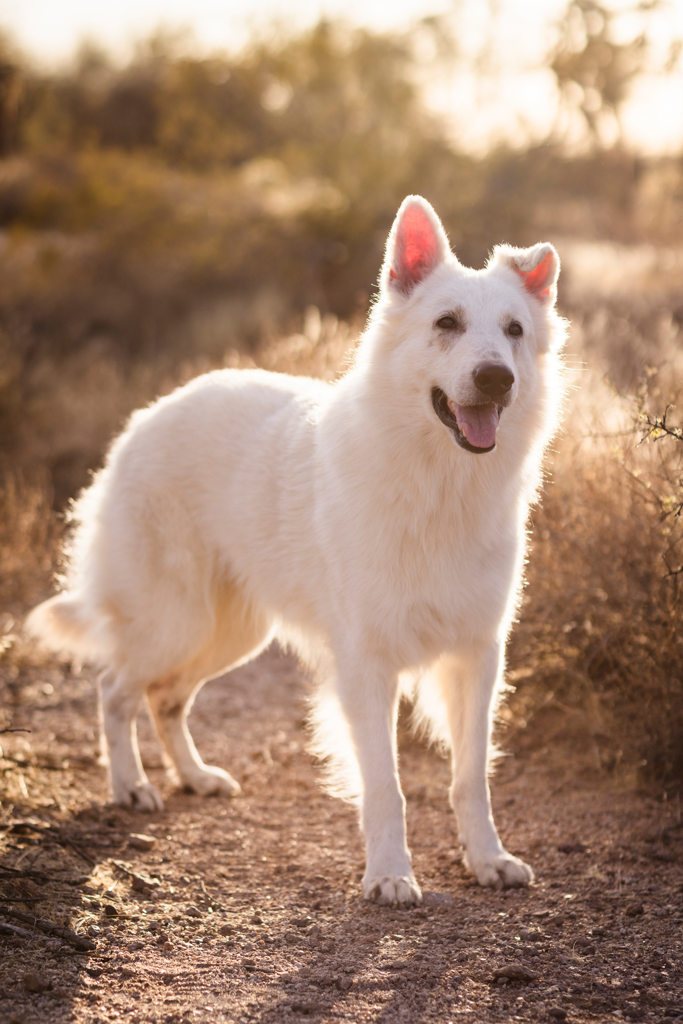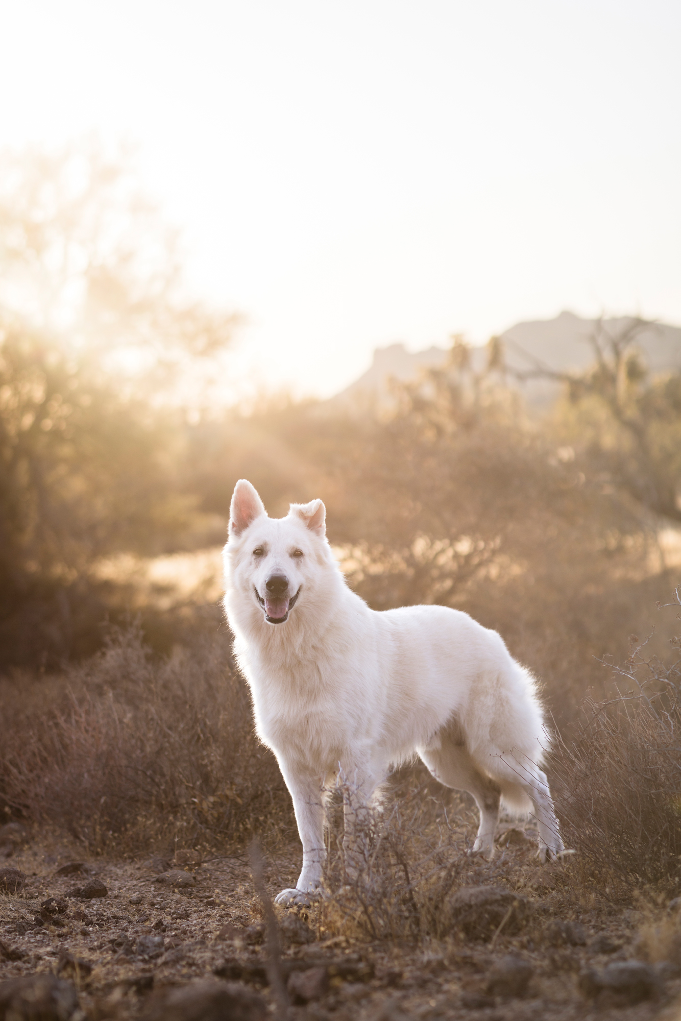 This stunning white Swiss shepherd joined us out at the Superstition Mountains in Apache Junction, Arizona, and the results were nothing short of cinematic. The contrast between Collins’ bright, flowing coat and the rugged volcanic landscape, warm desert tones, and sweeping Arizona sky made every frame feel like it was made for this location.