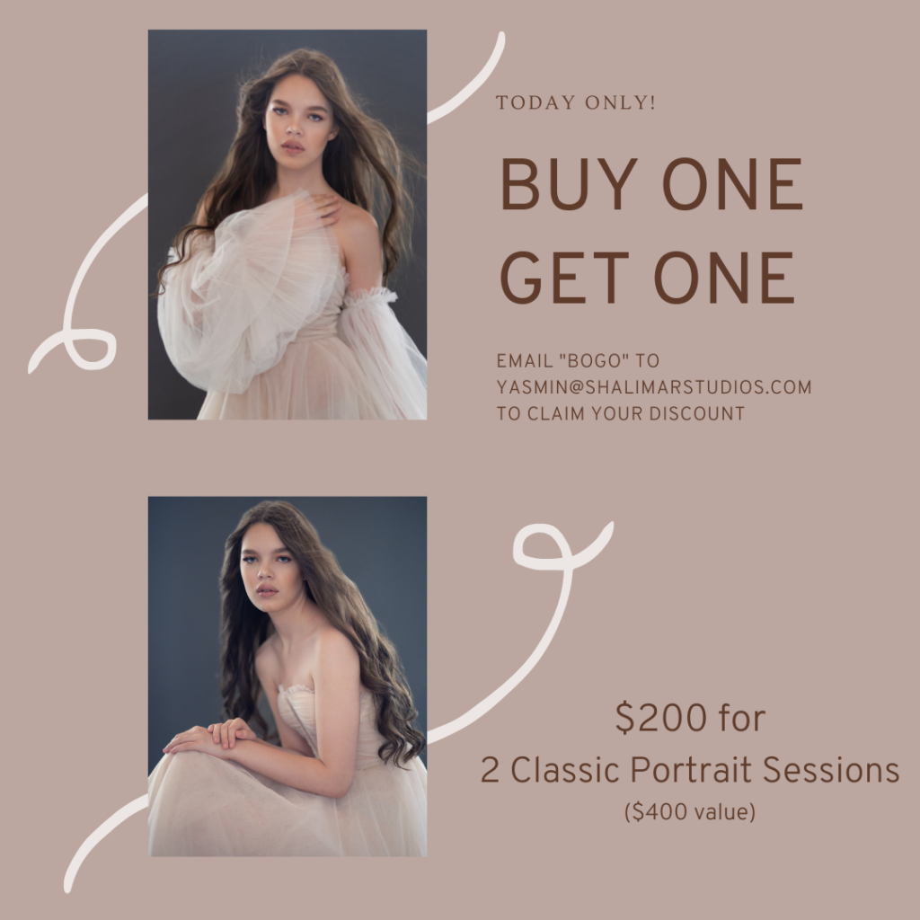 Click here to send us an email; put BOGO in the subject line and that’s it! We’ll process the payment and send you certificates for 2 Classic Portrait Sessions.