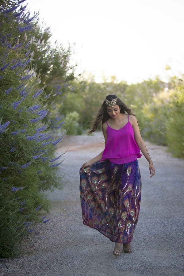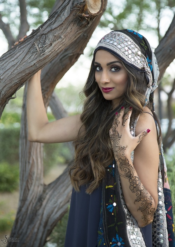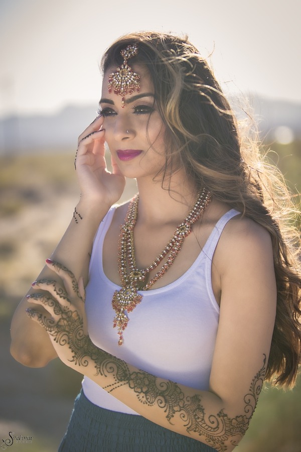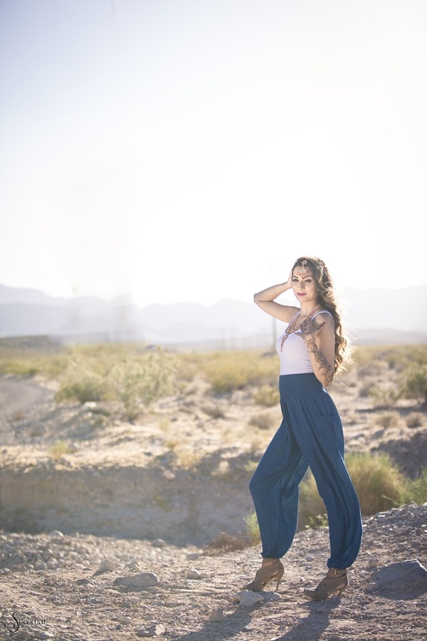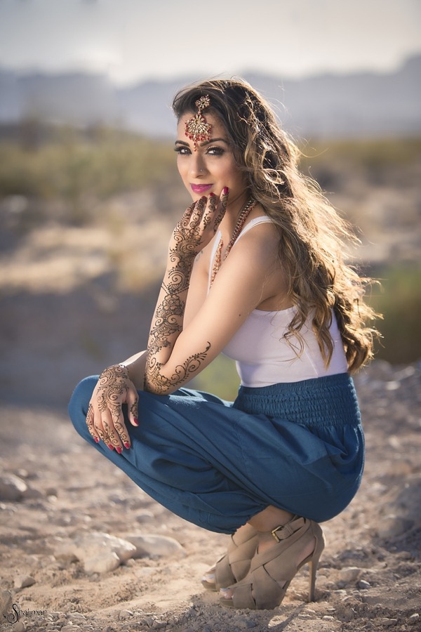 Our most recent shoot actually was the brainchild of a henna/mendhi artist from Sacramento, Ash. Ash was coming to Las Vegas to participate in a local South Asian event, and when I found out she would be here, I reached out to her asking if she wanted to collaborate on a shoot. Ash loved the idea of a gypsy/bohemian shoot in the desert featuring the beautiful henna designs she is known for in the Bay Area. It wasn't long before we set a date and exchanged inspiration images for the type of mood and overall feel of the shoot.
