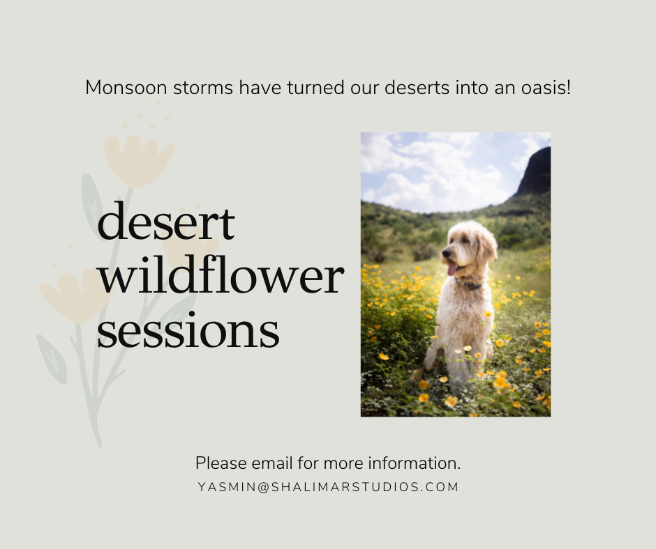 Hi Friends! The desert monsoon rains have turned our barren desert into a wildflower oasis! This won’t last long and rarely happens at this time of year. So to be able to take advantage of this special time, we are offering a Limited Edition Desert Wildflower Session. Your session fee is only $150 (regularly $200) so don’t wait to book this session today before the wildflowers disappear.