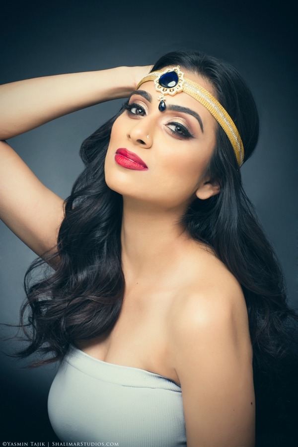 Not only does Lina do makeup, but she also styles hair, and as you'll see in the following images, she did an amazing job with different looks and styles for each wardrobe change.   And it is with each shoot like this, there is a bevy of activity behind the scenes in addition to hair/makeup stylist, photographer and model.  And so I want to recognize and send a big thank you to Michelle Wilson and Soniya Mody for assisting on the shoot, and to Sangita Umeria and Kalpana Mody for providing the gorgeous jewelry and wardrobe.  Thanks ladies for another memorable and fun shoot!