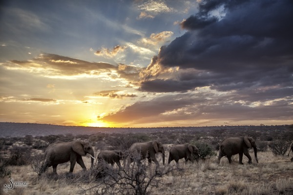 Last year in September I went on safari with my friend Isaac and spent 8 days in 4 different parks.  On this particular evening we came upon a massive herd of elephants walking just at sunset on our last night in the Samburu National Park.  It seemed every where we turned in this park there were elephants, and by far this herd was the largest we had seen with close to 40 elephants walking in a straight line.  If you've been on safari or had the opporunity to experience elephants up close, you know how quiet they are when they walk which seems counterintuitive to how massive they are and how loud their trumpets can be.  But this herd was no exception, and with a quiet confidence, they followed the paths of their ancestors, just as the maternal leaders were showing the young on this evening.