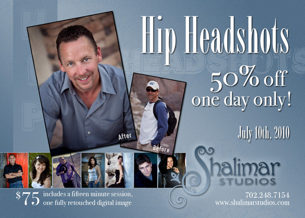 This special is 1 day only and you'll receive 50% off the regular price.  For $75 you get a 15 minute portrait session, and 1 high-resolution digital image, fully retouched.  So don't wait, spaces are limited.  Make sure you call and schedule your session before time runs out.  July 10th, is the day you will break through the masses and stand out with a beautiful new headshot by Shalimar Studios.