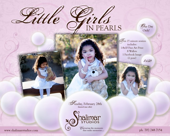 Don't miss this special time in your little girl's life, all dressed up in pearls. It's for one day only on Sunday, February 28th, at Exploration Park in Mountain's Edge at Blue Diamond and Buffalo. Times are limited so make sure to call and make your appointment soon. I can't wait to see your Little Girls all dressed up!