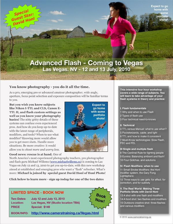 I've been so fortunate to be surrounded by wonderful teachers in my photography career, and one of those is flash and lighting guru Michael Willems from Canada. Always in search of furthering my education and knowledge, I attended one of Michael's flash classes in Phoenix this past December and by all means came away from that class with more practical knowledge than I expected. Since that class I have been diligently working to get Michael to Las Vegas to teach a class and voila, it worked! See below for more information on his 2 can't-miss classes in the Las Vegas area with special guest, Dave Honl.