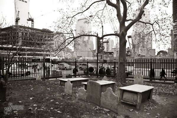The next few images are from St. Paul's Chapel, directly across the street from Ground Zero. Here below, the graveyard looks upon the construction and rebuilding.