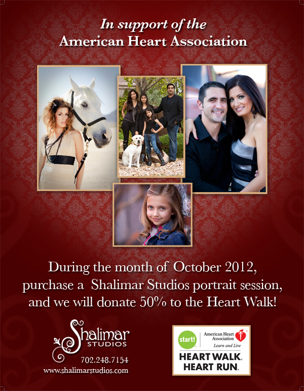 It's that time of year again where we launch our annual portrait fundraiser benefitting the American Heart Association. We each know someone or have personally been affected by heart disease and stroke, the #1 and #3 killers in the US. So for every portrait session purchased in the month of October, we will donate 50% of that to the Heart Walk! It's a great way to get an early start on your Holiday family portraits and help a worthy cause. Please call the studio to book your session today!