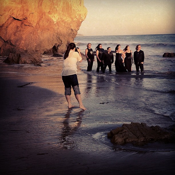 You may recall that about a year and a half ago I photographed the symphonic metal band Ashentide in Los Angeles. Here’s a quick link to the blog post of the images from that photo shoot. Since then, they’ve welcomed some new band members so this past weekend I was again down in Los Angeles photographing the band for updated images. I must say, I haven’t had this much fun at a shoot in a while. I say that because not only were we shooting at a gorgeous beach in Malibu, but we all ended up in the water too! Each band member is so much fun and they all have great personalities. They were up for anything that I had them do including sitting in the sand, posing in front of ominous rock outcroppings, and of course standing in the cool Pacific ocean! There were about 11 of us total on location and we all had a blast. Here’s a behind the scenes image my assistant captured of one of our last band images of the day.
